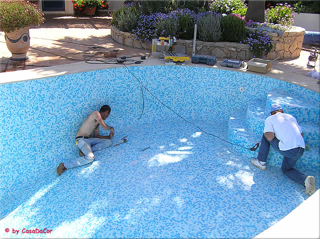 Finalização da recuperação de uma piscina. Após a demolição da estrutura de betão, foram realizados os seguintes passos: Novo reboco e betonilha, impermeabilização de dois componentes, aplicação de um mosaico “Trend” em peças pequenas de 2x2cm e o enchimento das juntas foi feito com base em resina epoxi.