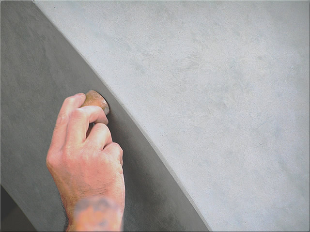 Centímetro quadrado por centímetro quadrado com movimentos de pressão circulares, o reboco de Tadelakt é compactado durante o processo de endurecimento com uma pedra especial para ganhar seu efeito típico de mármore. Trabalho exigente!