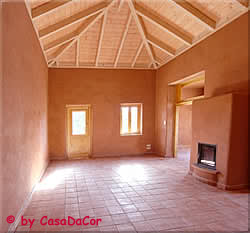 Die mit Leichtlehm verfüllte Holzrahmenkonstruktion verknüpft in besonders vorteilhafter Weise Massivhaus-Eigenschaften mit der feuchtigkeitskompensierenden Wirkung von Lehmhäusern - ideal für den sommerlichen Wärmeschutz und die winterlichen Feuchtigkeitsprobleme an der Algarve.